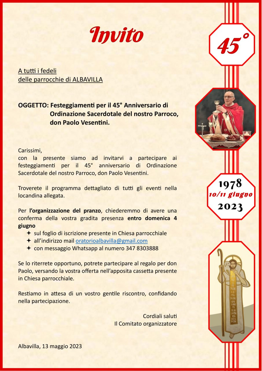 Nei giorni 9, 10 e 11 giugno 2025 le tre parrocchie organizzano un pellegrinaggio a Roma in occasione del Giubileo. Per maggiori informazioni scarica il programma cliccando qui.